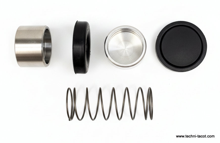2 steel pistons, 2 cups, 2 dust covers, 1 spring